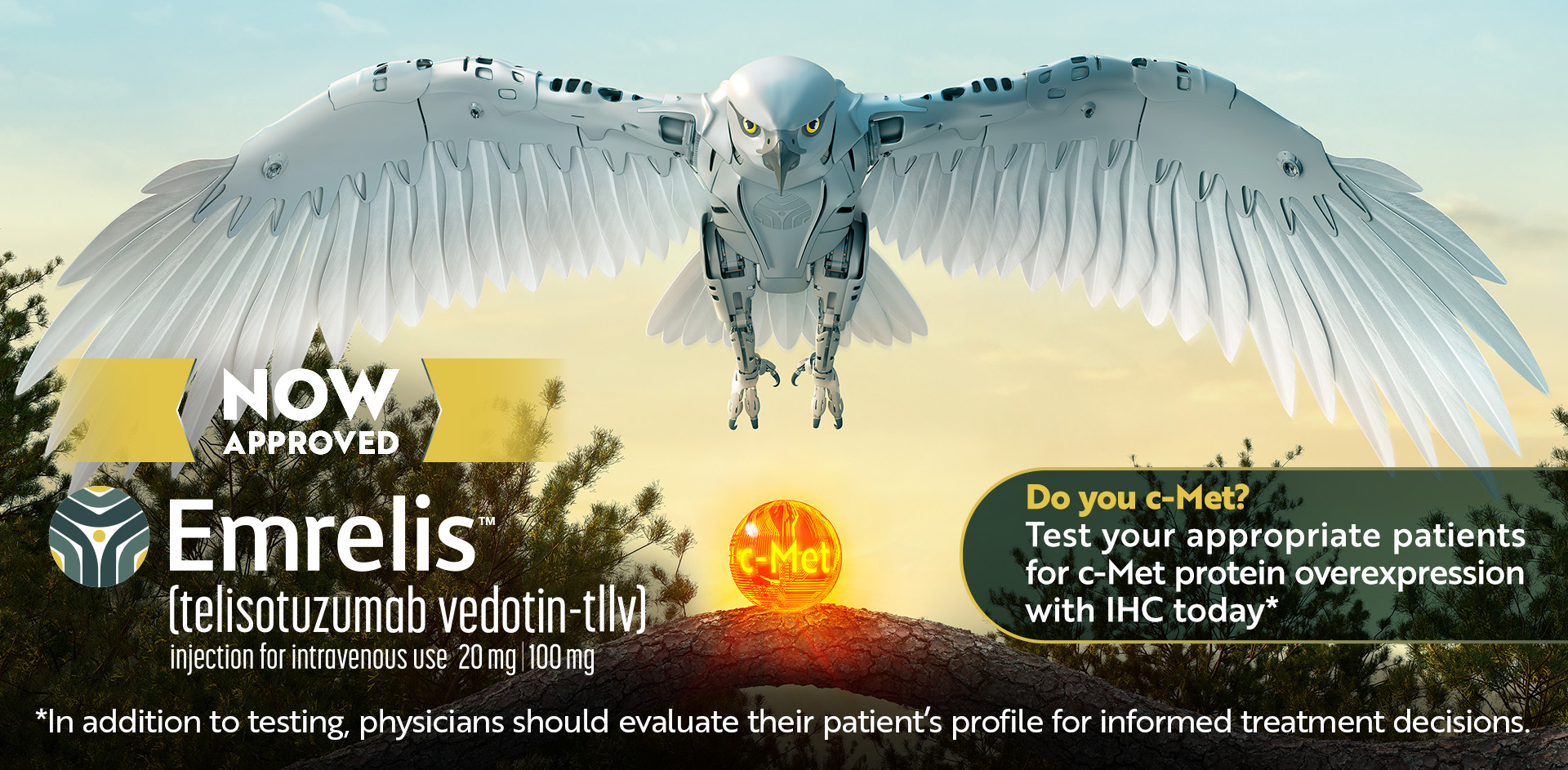 1. EMRELIS [package insert]. North Chicago, IL: AbbVie Inc.; 2025. 2. Camidge DR, Bar J, Horinouchi H, et al. Telisotuzumab vedotin monotherapy in patients with previously treated c-Met protein–overexpressing advanced nonsquamous EGFR-wildtype non–small cell lung cancer in the Phase II LUMINOSITY Trial. J Clin Oncol.