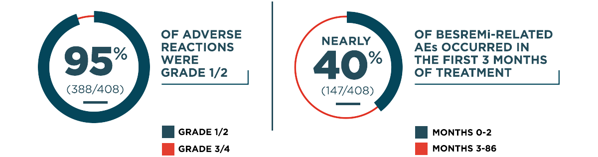 Pancreatitis: Pancreatitis has occurred in 2.2% of patients receiving BESREMi. Symptoms may include nausea, vomiting, upper abdominal pain, bloating, and fever. Patients may experience elevated lipase, amylase, white blood cell count, or altered renal/hepatic function. Interrupt BESREMi treatment in patients with possible pancreatitis and evaluate promptly. Consider discontinuation of BESREMi in patients with confirmed pancreatitis.